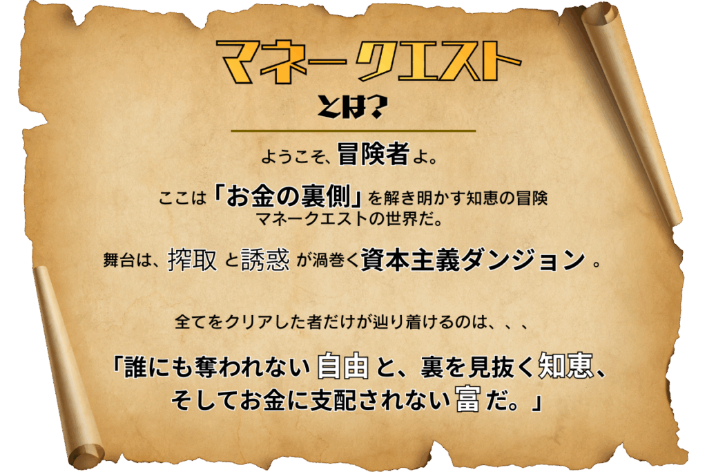 マネークエストTOP 2025.10.072025.10.09 さぁ、自由を得るために「お金のクエスト」を攻略せよ。 ▼ クエストSTART ▼ ※準備中※ NEWS ・10/7(火)マネークエストOPEN